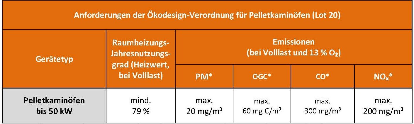 Die Ökodesign-Anforderungen für neue Festbrennstoff-Einzelraumheizgeräte bis 50 kW gelten seit dem 1. Januar 2022, traten also zwei Jahre später in Kraft als die für Festbrennstoffkessel. Sie betreffen auch alle Pelletkaminöfen, also sowohl luft-als auch wasserführende Geräte. Diese Vorgaben umfassen: