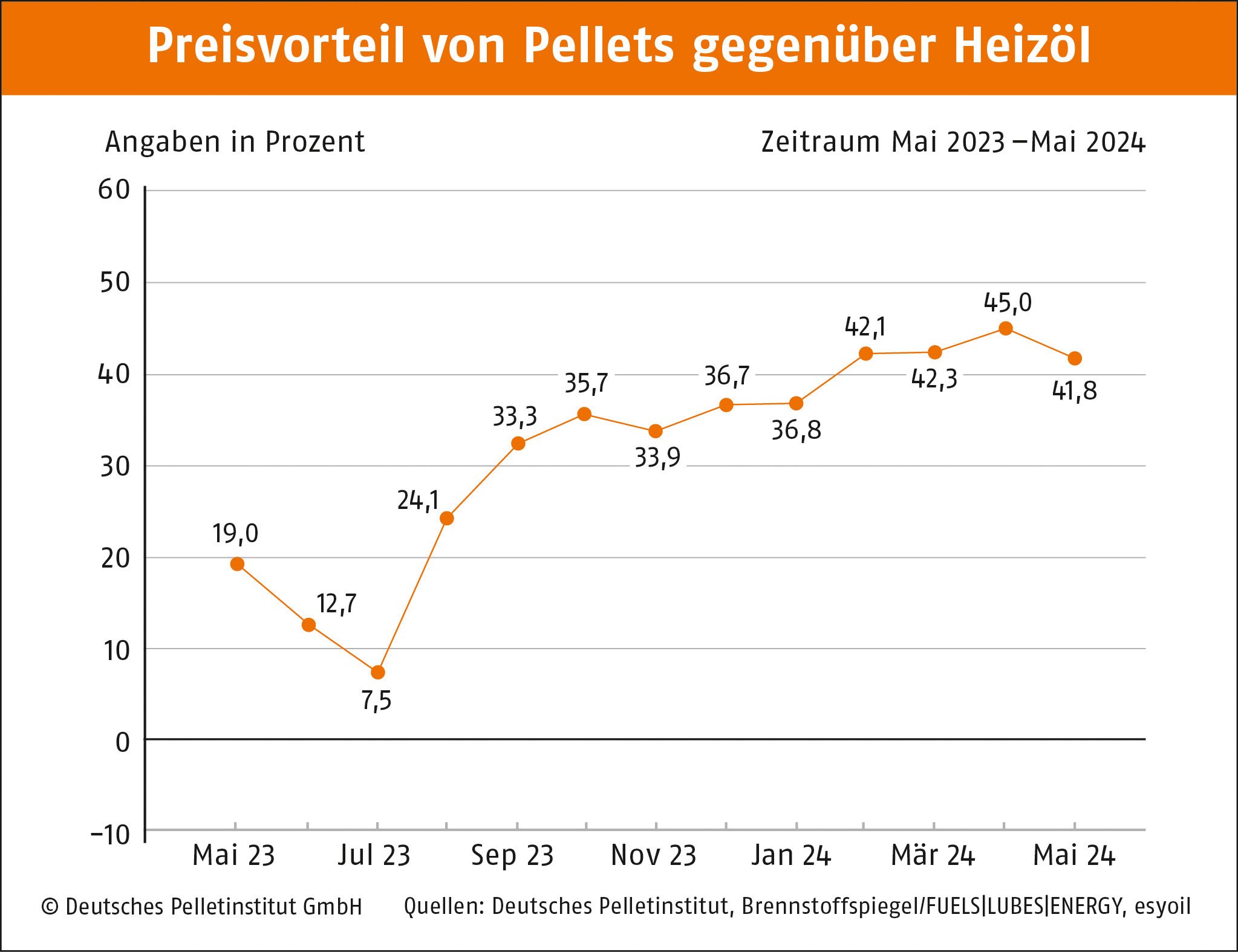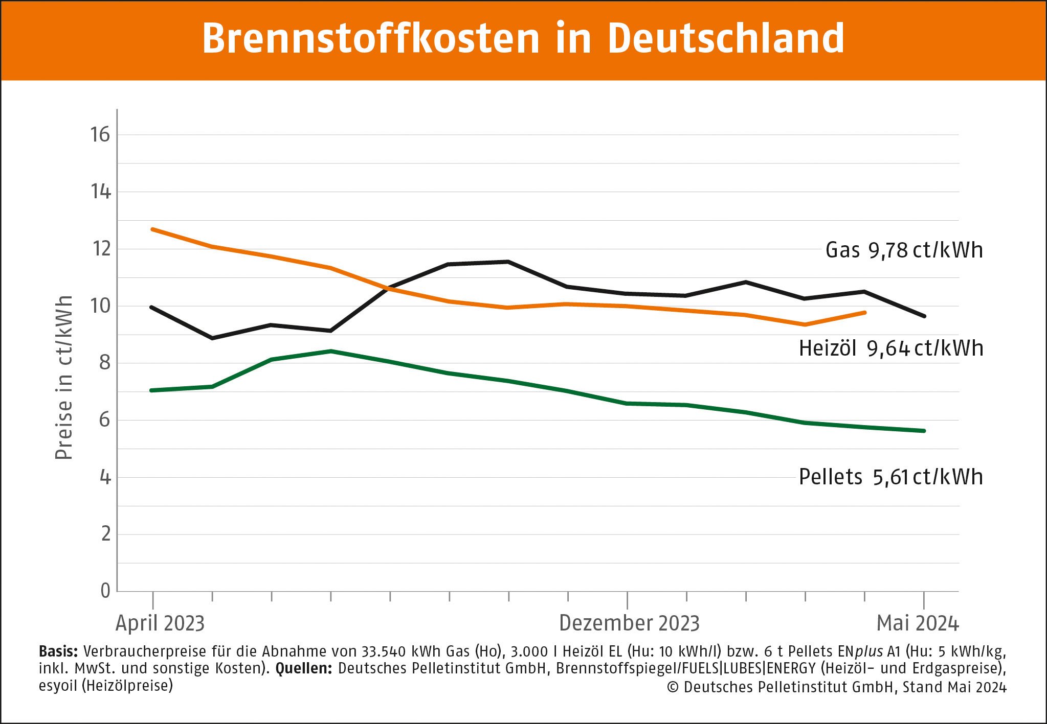 Berlin, 16.05.2024 • Eine Tonne (t) Holzpellets kostet im Mai im Durchschnitt 280,69 Euro. Gegenüber dem Vormonat April ist der Preis laut dem Deutschen Pelletinstitut um 2,8 Prozent gesunken. Pro Kilowattstunde Wärme zahlen Pelletheizer derzeit 5,61 Cent. Die Preisersparnis gegenüber Heizöl liegt bei rund 42 Prozent und gegenüber Erdgas bei rd. 43 Prozent.