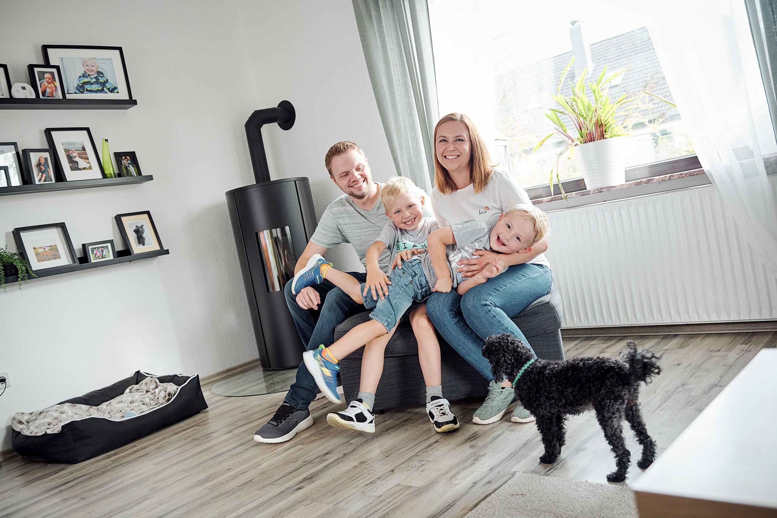 Familie macht es sich vor dem Pelletkaminofen gemütlich