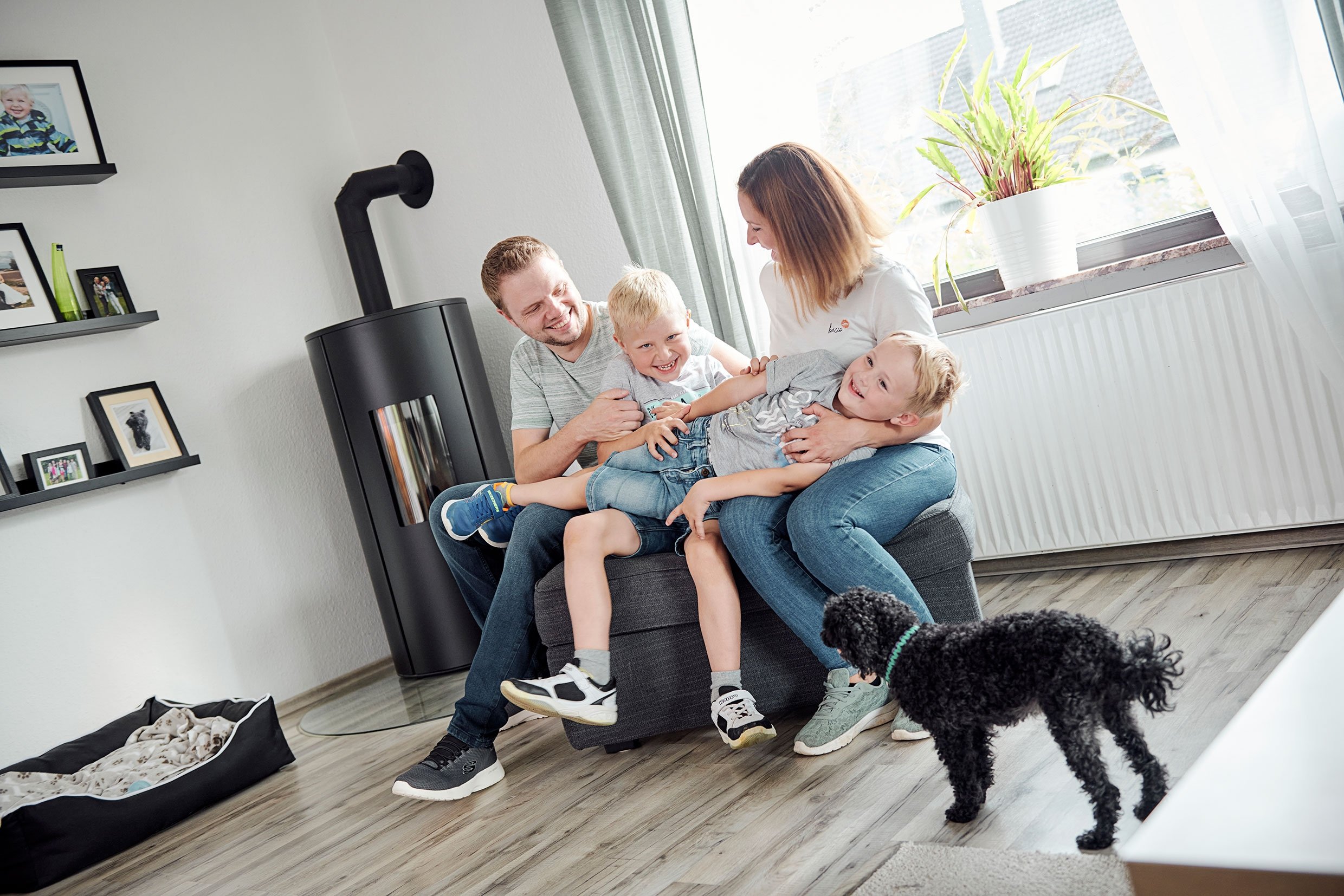 Familie vor dem Pelletkaminofen