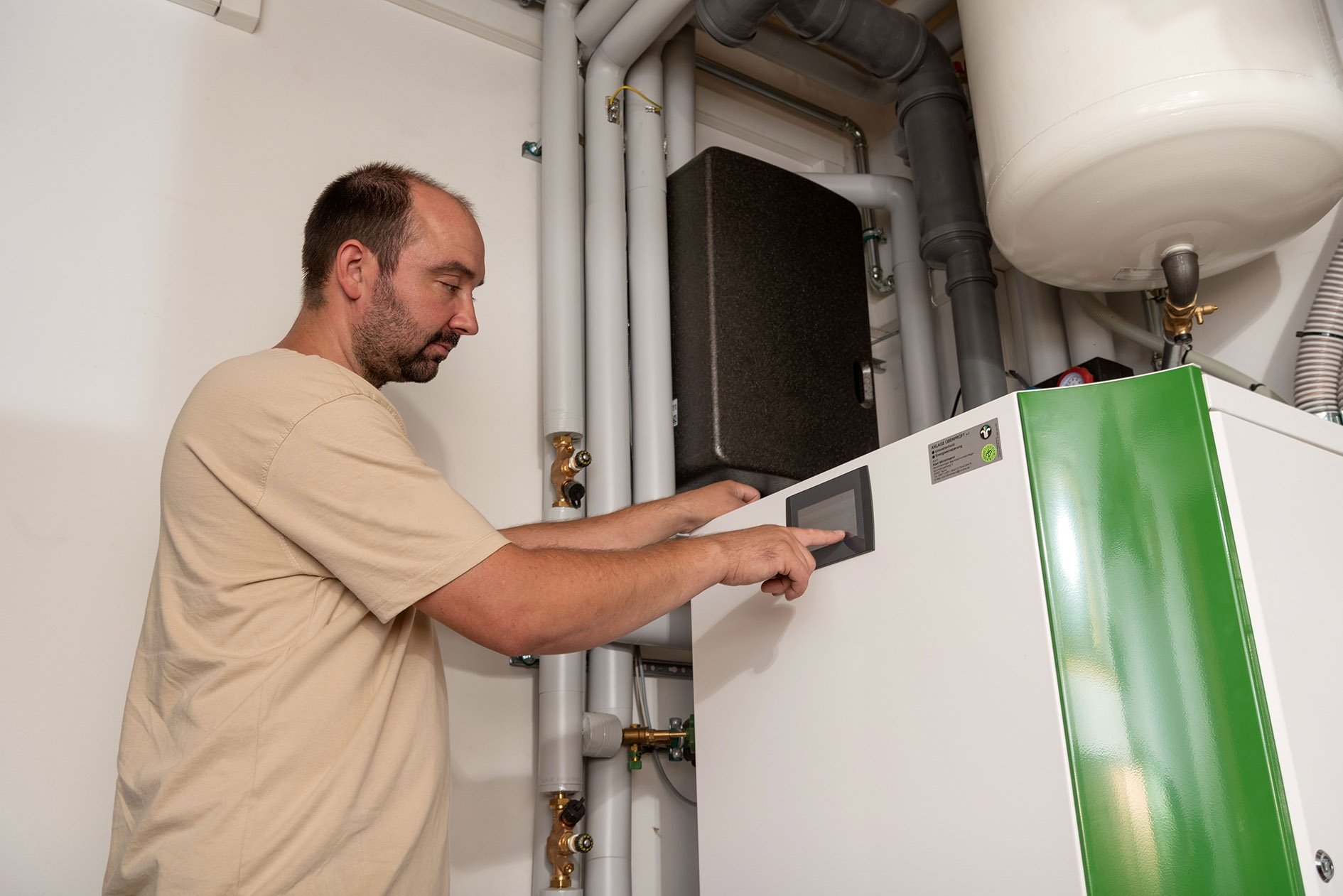 Mann bedient Pelletkessel