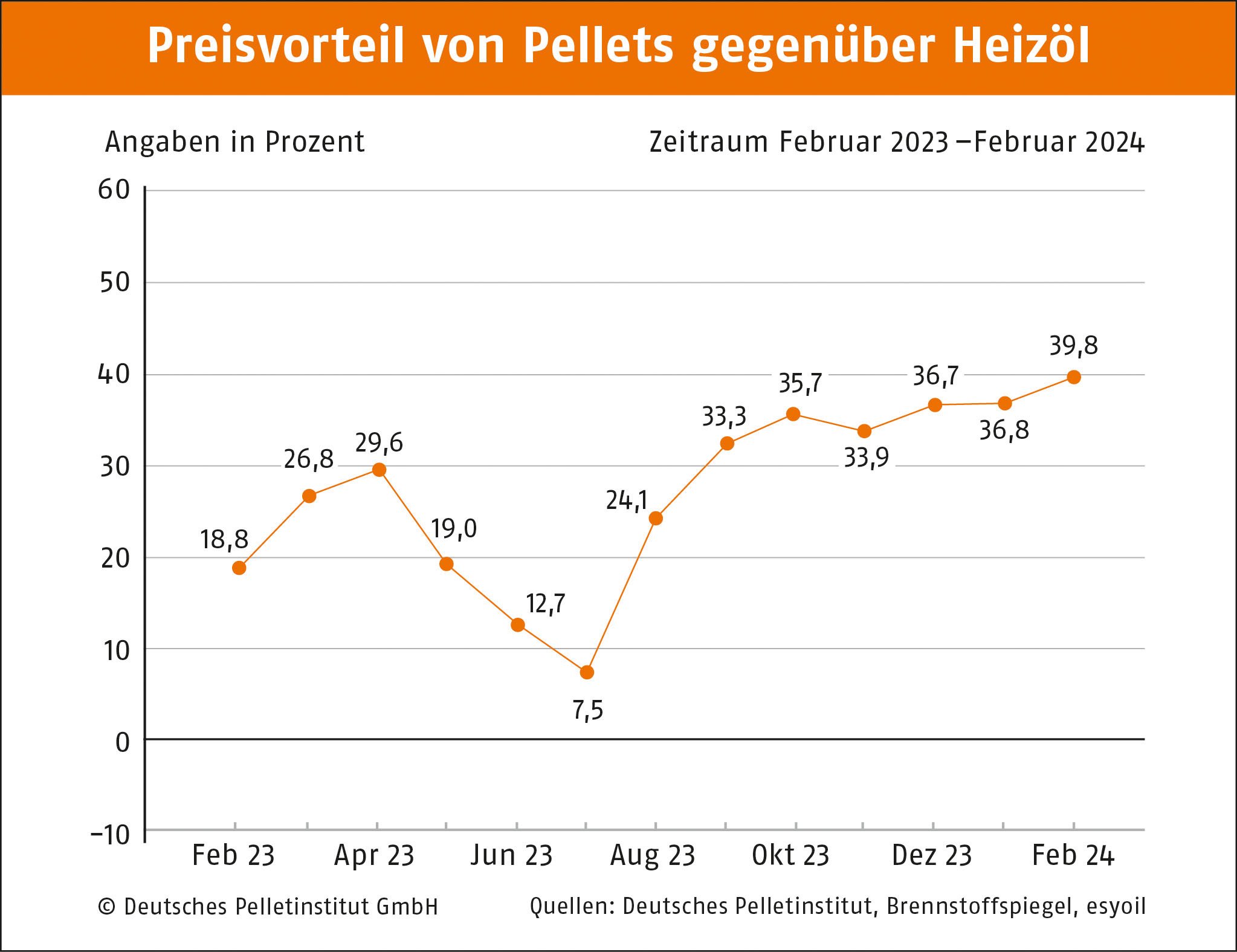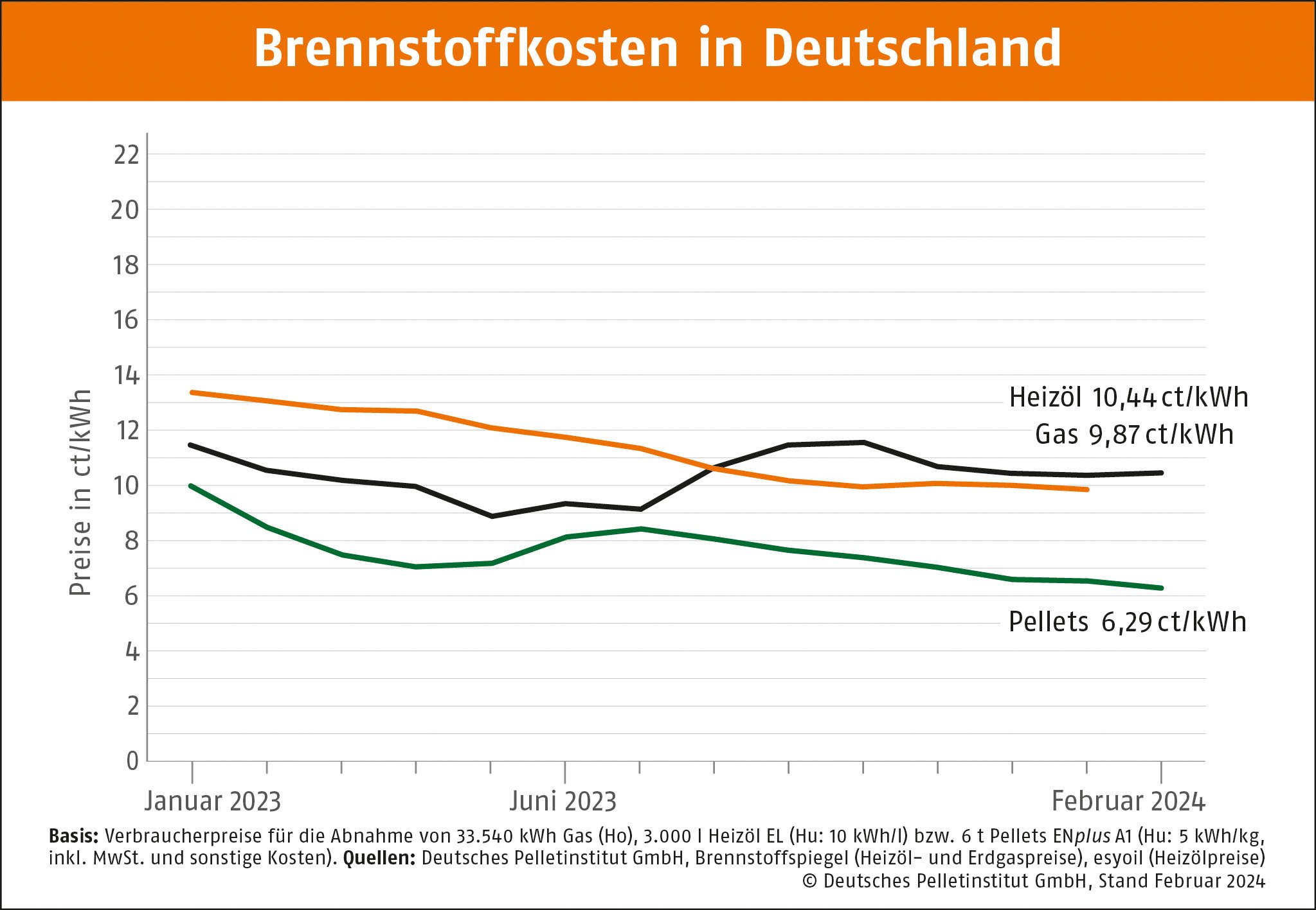 Berlin, 16.02.2024 • Auch im Februar ist der Preis für Holzpellets in Deutschland leicht gesunken. Der durchschnittliche Tonnenpreis beträgt 314,30 Euro, berichtet das Deutsche Pelletinstitut (DEPI). Im Vergleich zum Vormonat sind das 3,9 Prozentweniger. Demnach kostet eine Kilowattstunde Wärme aus Pellets 6,29 Cent. Gegenüber Heizöl besteht ein Preisvorteil von rund 40 Prozent, zu Erdgas von rd. 36 Prozent.