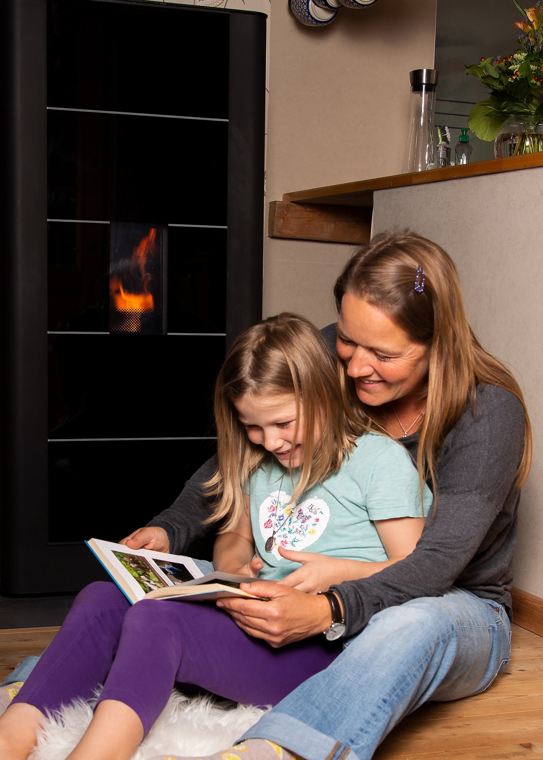 Pelletfamilie liest zusammen vor dem Pelletkaminofen