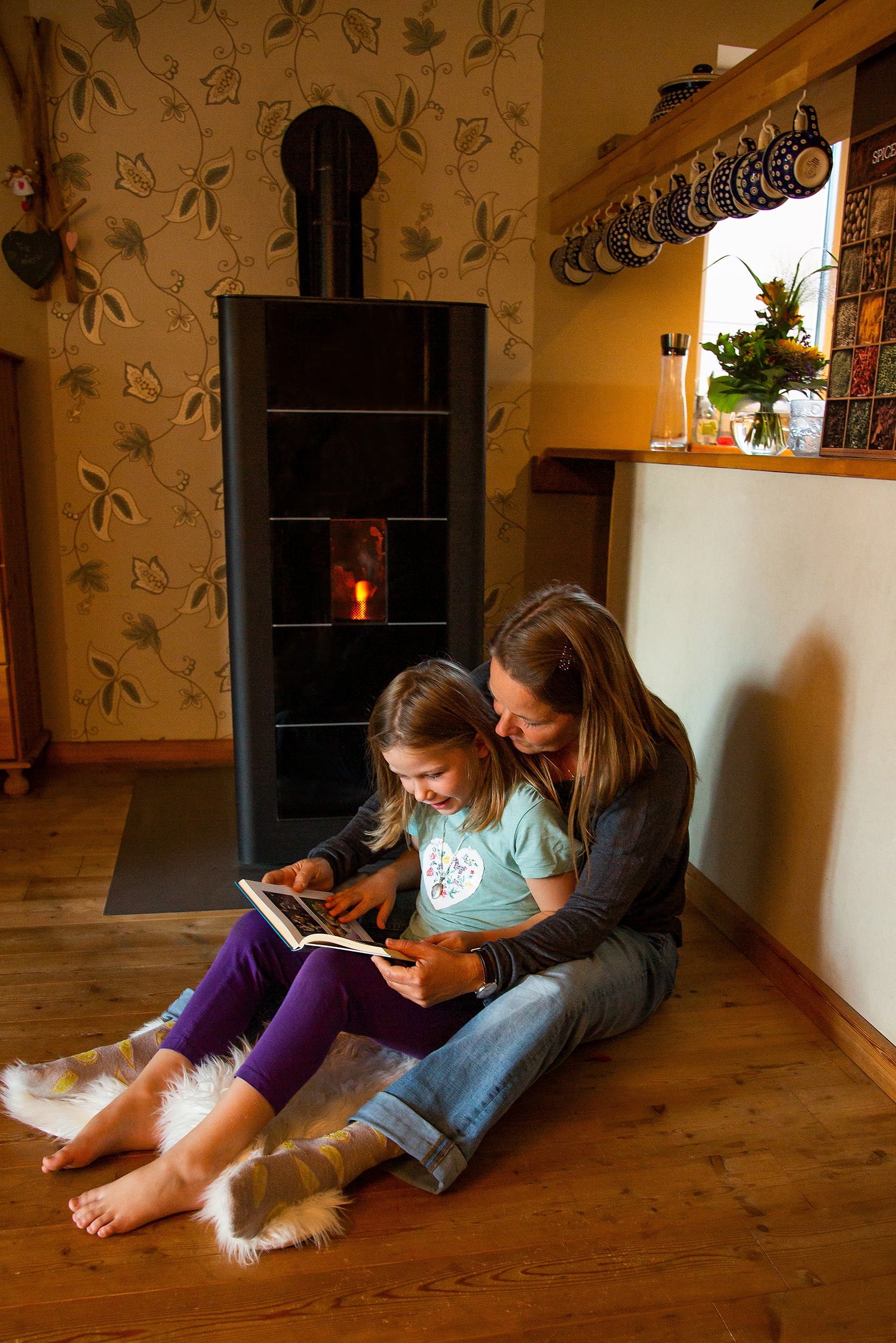Pelletfamilie macht es sich vor dem Pelletkaminofen gemütlich