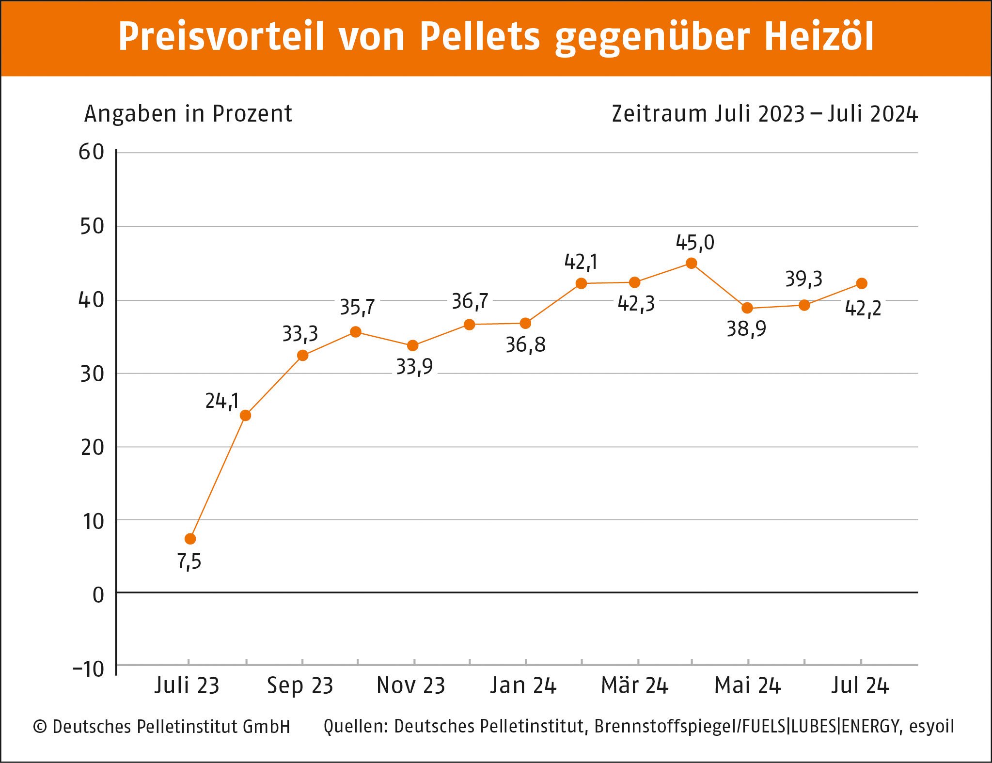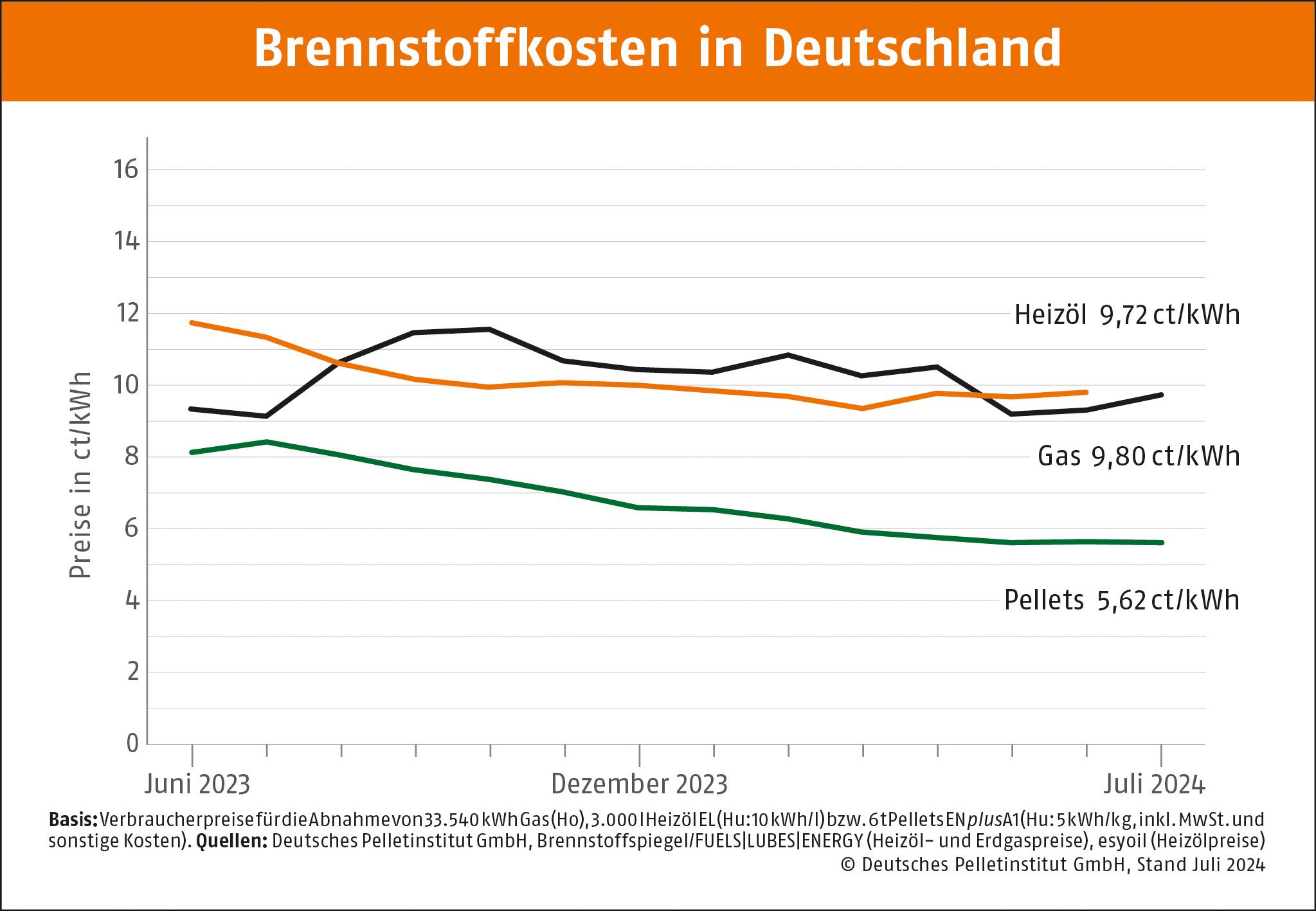 Berlin, 18.07.2024 • Der Preis für Holzpellets bleibt im Juli auf konstant niedrigem Niveau. Im Durchschnitt kostet eine Tonne des klimafreundlichen Brennstoffs 280,99 Euro. Seit dem Vormonat Juni ist der Preis um 0,5 Prozent gefallen, wie das Deutsche Pelletinstitut berichtet. Wärme aus Pellets kostet derzeit 5,62 Cent pro Kilowattstunde. Pelletheizer sparen rund 43 Prozent gegenüber Erdgas und rd. 42 Prozent gegenüber Heizöl.