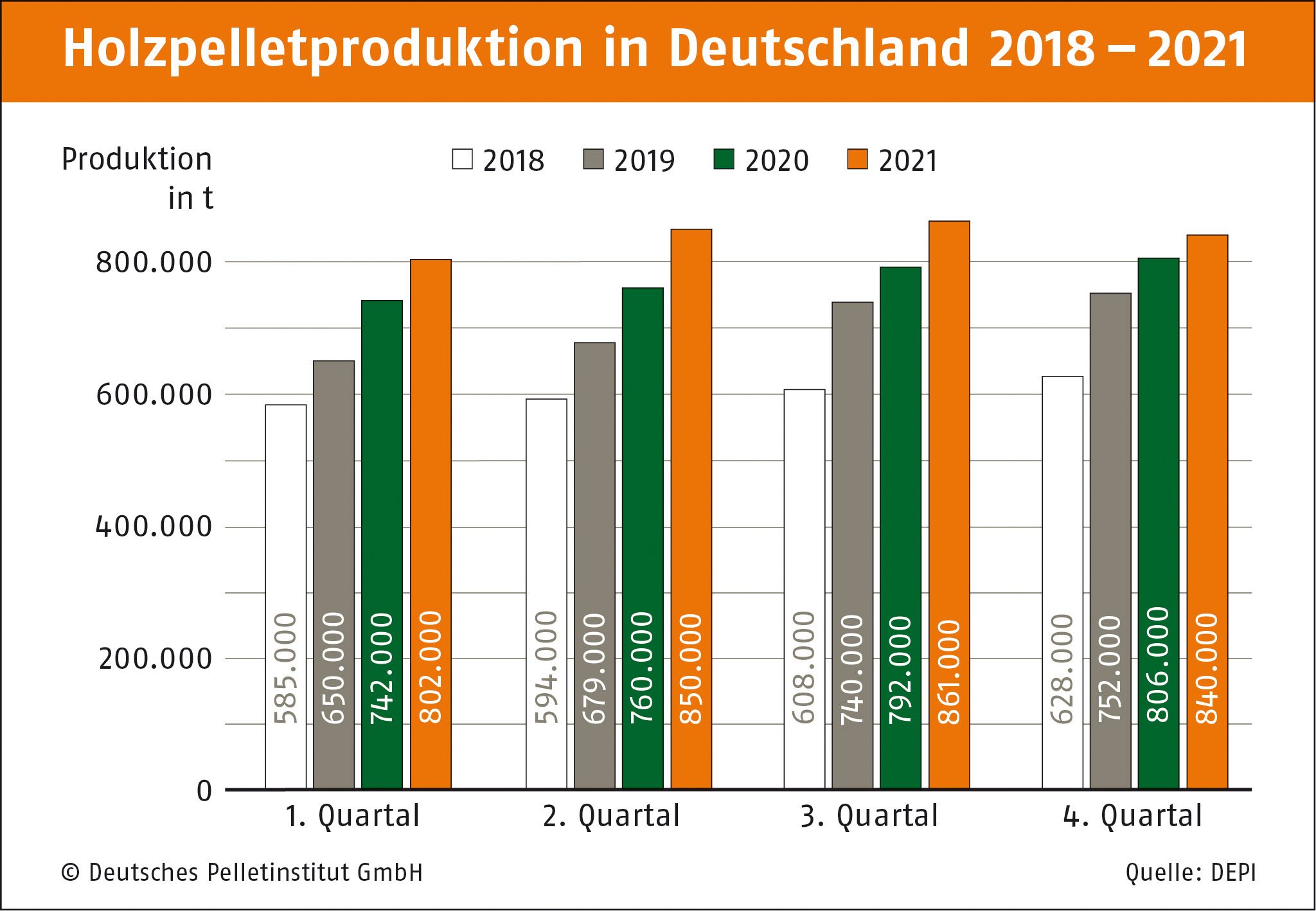 Berlin, 21.10.2021 • Mit 861.000 Tonnen (t) wurde im dritten Quartal 2021 in Deutschland erneut eine bis dato noch nie innerhalb von drei Monaten erzeugte Menge an Holzpellets hergestellt. Der Wert bedeutet eine Steigerung von 1,3 Prozent im Vergleich zum letzten Quartal (850.000 t) und von 8,7 Prozent im Vergleich zum Zeitraum Juli bis September 2020 (792.000 t).